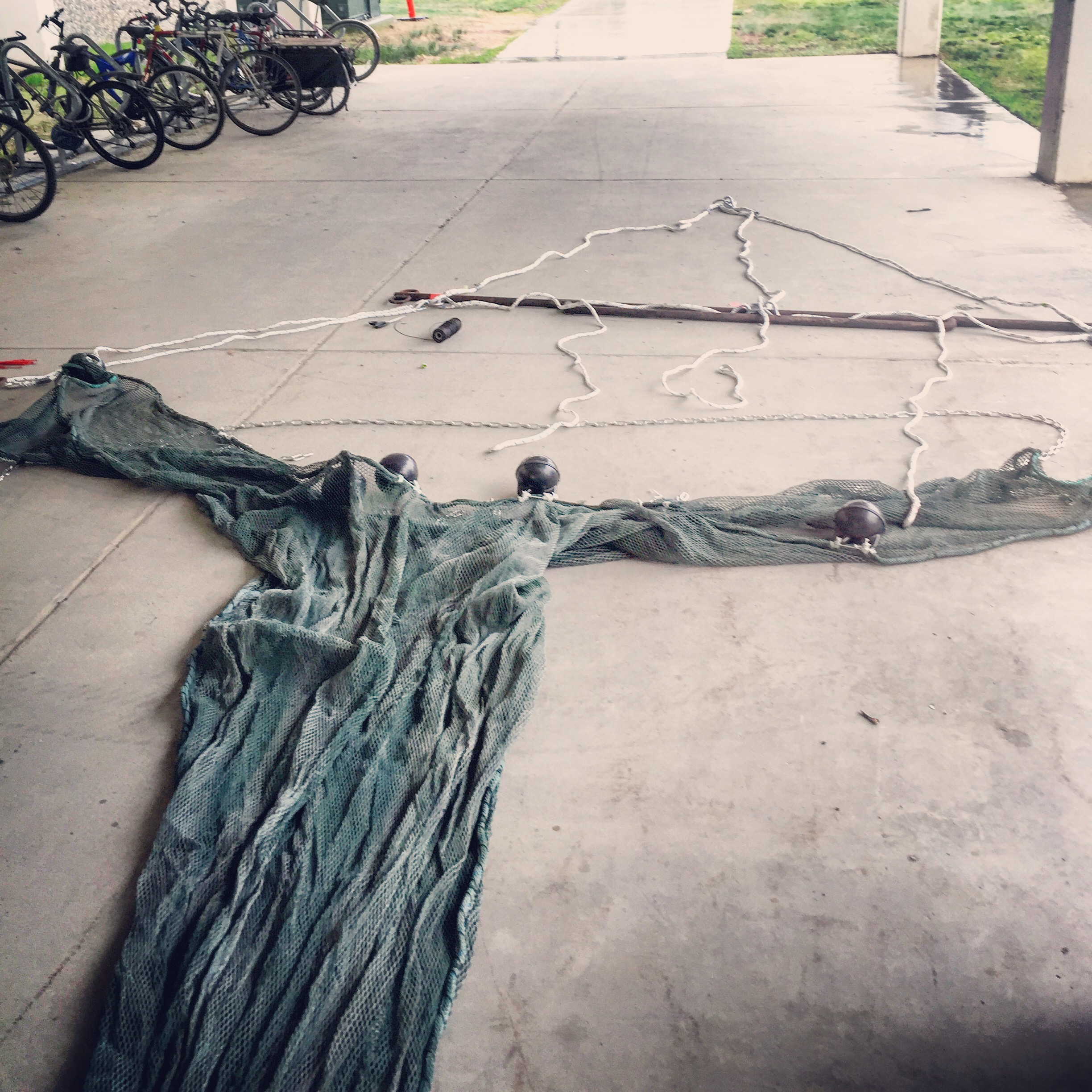 A trawl net hangs down vertically in the water with a float line on top and a lead line on the bottom to keep it oriented correctly. A beam across the front ensures the mouth of the net stays open. The net is then towed horizontally through the water and critters are collected in the net’s long tail. Most scientists use trawl nets to catch fish, but my group will use the net to collect bivalves that live on and in the seafloor sediments. That means we’re going to let out a lot of line to pull the net directly over the sea bottom. AKA we’re going to get very muddy!