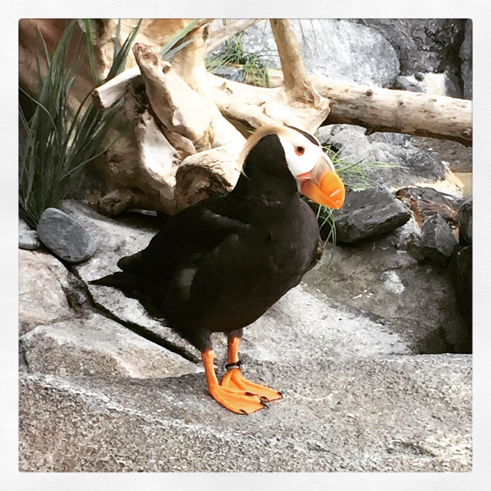 They are stout little birds who are graceful in the water, but awkward on land due to their legs being better positioned for swimming rather than walking. They have to flap their wings 200x per minute just to keep airborne and often appeared to be struggling to fly. It took some birds several tries to make it from the water to their nest high up one cliffs! The next day, we visited puffins and other Alaskan sea life up close at the Alaska Sea Life Center.