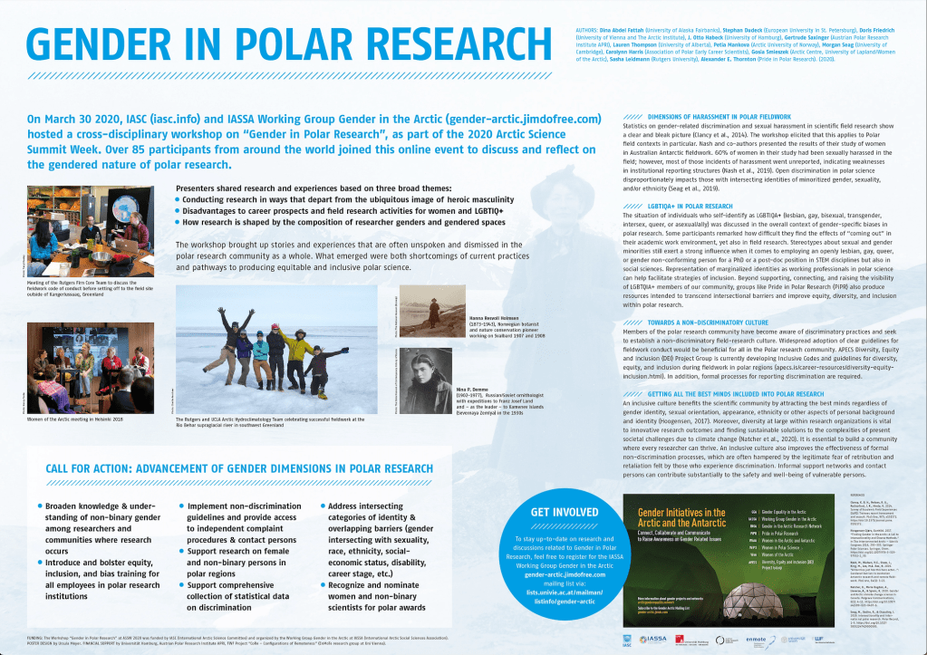 Fattah, D.A., S. Dudeck, D. Friedrich, J. O. Habeck, G. Saxinger, L. Thompson, P. Mankova, M. Seag, C. Harris, G. Smieszek, S. Leidmann, A.E. Thornton. 2020. Gender in Polar Research. Scientific Committee on Antarctic Research Open Science Conference. Poster Presentation.